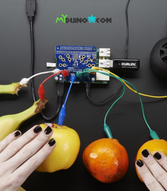 The HAT has 12 ‘figure 8’ holes in it that can be gripped onto with alligator clip cables. Attach one side of the clip to the HAT and the other side to something electrically conductive (like metal) or full of water (like vegetables or fruit!) Then start up our handy Python library code to detect when the object is touched. That’s pretty much it, very easy! For advanced users, you can also solder to a pad to make a slimmer & more permanent connection.