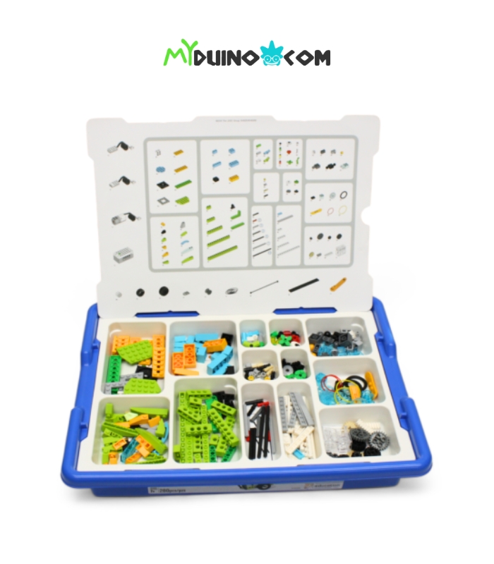 The WeDo 2.0 Core set (Compatible Kit) is delivered in a blue storage bin and comes with a sorting tray and labels, 280 LEGO system building elements, a low-energy Bluetooth Smarthub, a medium motor, a motion sensor, and a tilt sensor. Include an extra 110 parts and a Rechargeable Lithium Battery.