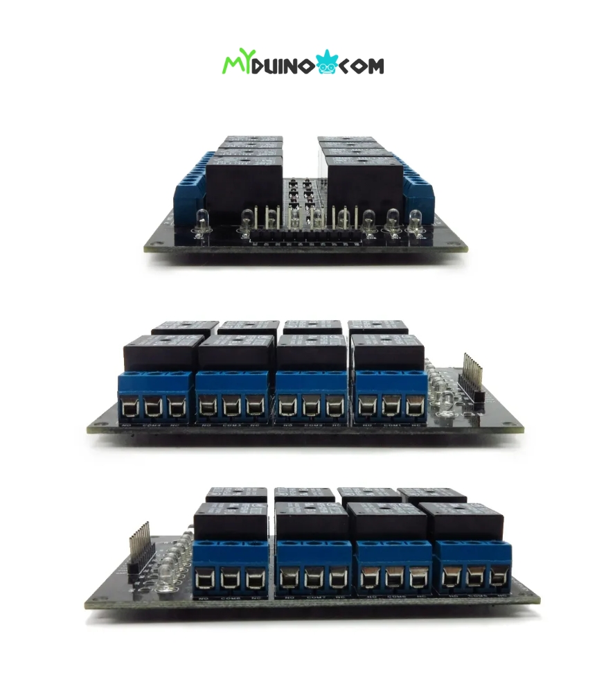 8 relays are included in this module, with “NC” ports mean “Normally connected to COM” and “NO” ports mean “Normally open to COM”. This module is also equipped with 8 LEDS to show the status of relays.
