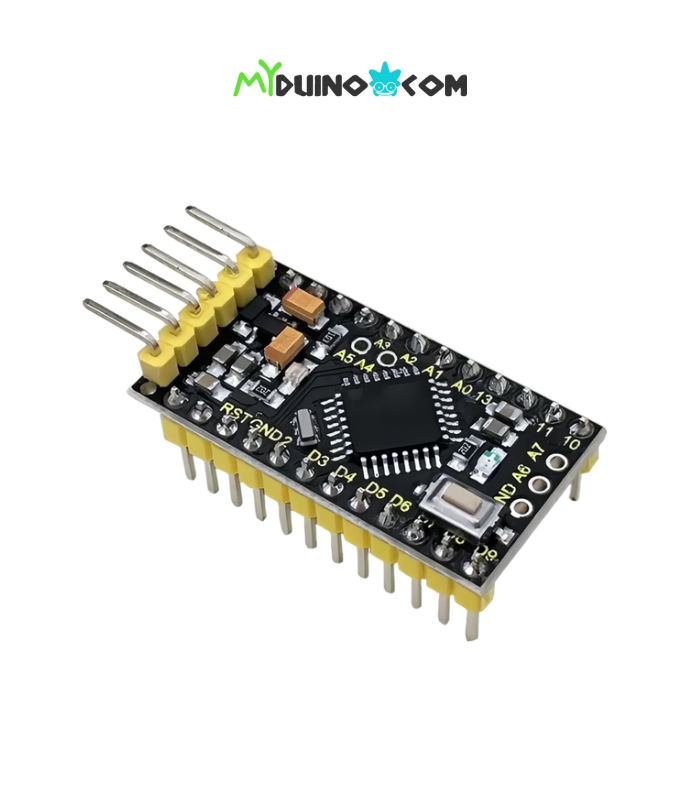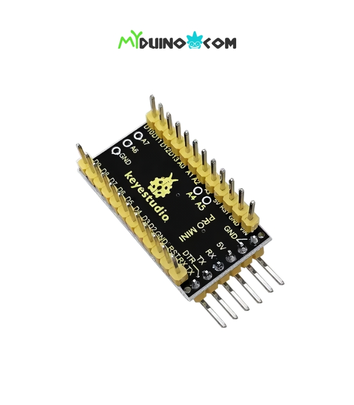 The ATmega328-based keyestudio Pro Mini is a tiny microcontroller board. Intended for usage on breadboards and when space is limited. It contains 14 digital input/output pins (six of which may be used as PWM outputs), 8 analog inputs, a crystal oscillator operating at 16 MHz, and a reset button. It should be noted that the board lacks an inbuilt USB to Serial connector. An extra USB to Serial module is required to program the Pro Mini. The Pins 5V GND (DC 5V) or female headers Vin GND (DC 7-9V) can be used to power the Keyestudio Pro mini.