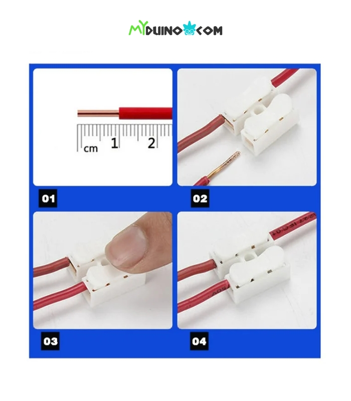 Press the spring clip, insert wires ( please correctly connect for + and -), and release the press clip. It is easiest to use a terminal block to connect two wires.